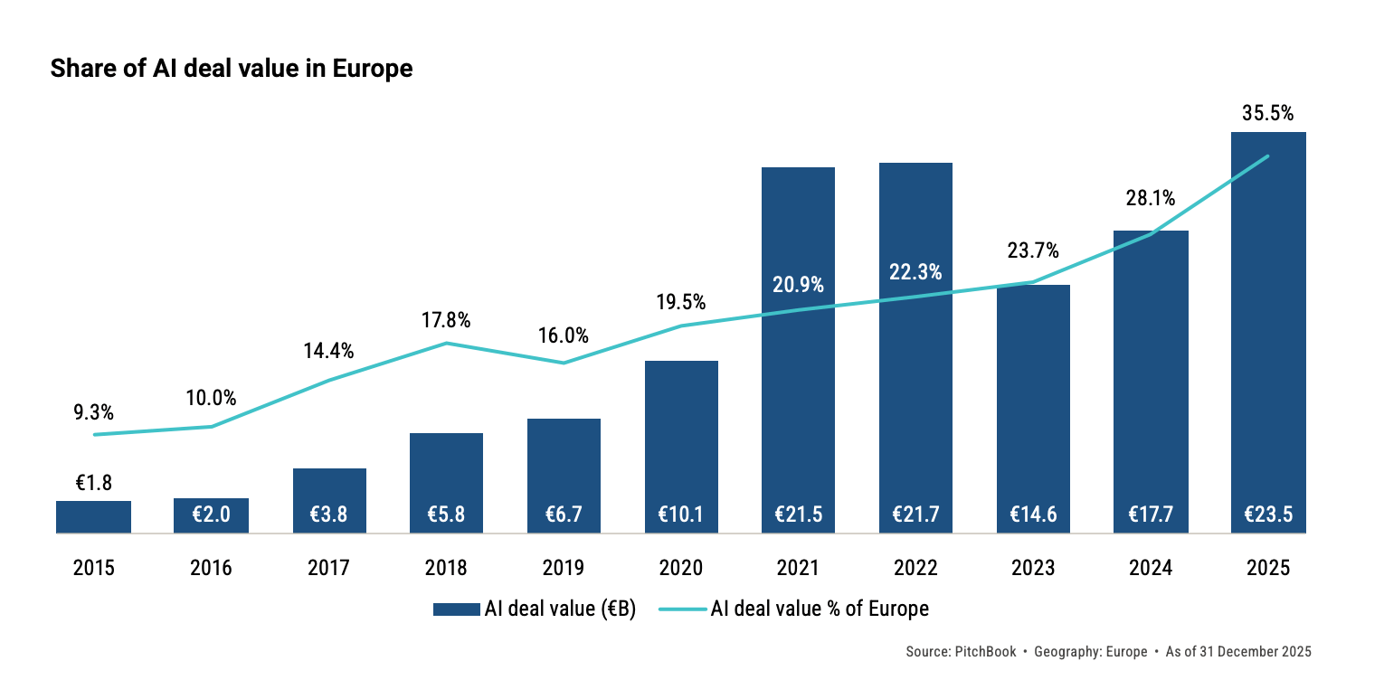 🙋♂️ Quiz: In 2025, AI deals captured 65.4% of deal value in the US. What % of deal value in 2025 did AI deals capture in Europe?