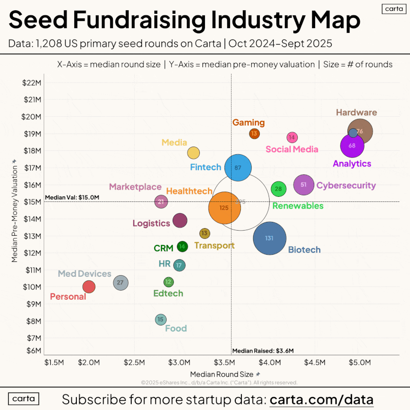 According to data from Carta, hardware startups are raising the largest seed rounds at median pre-seed valuations of $19 million. Although AI applications average slightly smaller round sizes at $4.5 million, their valuations are the highest of the group at $20 million pre-money.