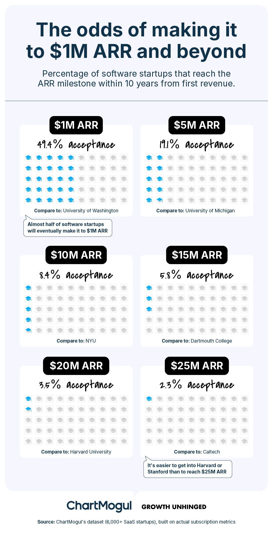 Interestingly, nearly 50% of startups reach $1M ARR within 10 years of monitizing. That’s not bad for a bootstrapped business or SME, but only 1/50 reach $25M ARR or higher—another indicator of why the VC-funded route isn’t the best fit for all types of startups.